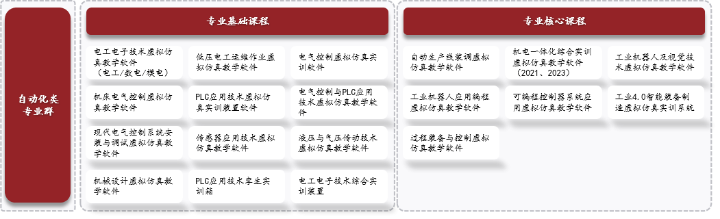 通過專業(yè)基礎(chǔ)課、專業(yè)核心課、專業(yè)拓展課的延伸拓展,提供圍繞自動控制相關(guān)基礎(chǔ)理論、核心能力及擴(kuò)展應(yīng)用的課程內(nèi)容,通過軟件及資源、硬件設(shè)備和工程實訓(xùn)的體系,為教學(xué)提供全方位支撐。